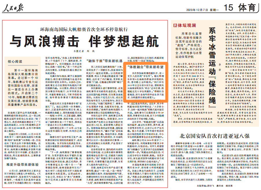 体教融合,育人为本。贯彻落实国家体育总局和教育部联合印发《关于深化体教融合促进青少年健康发展的意见》,公司不断加强公司体育工作、完善员工体育竞赛体系,全方位推动深化体教融合,促进员工全面健康成长。《人民日报》第26448期体育板块报道环海南岛帆船赛的专题中,对公司“体教融合”的案例做了专门报道。